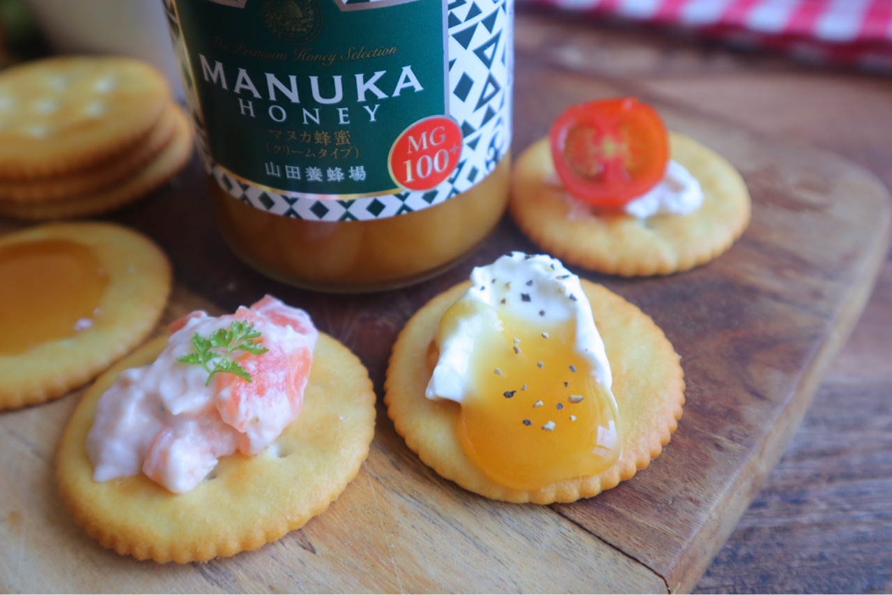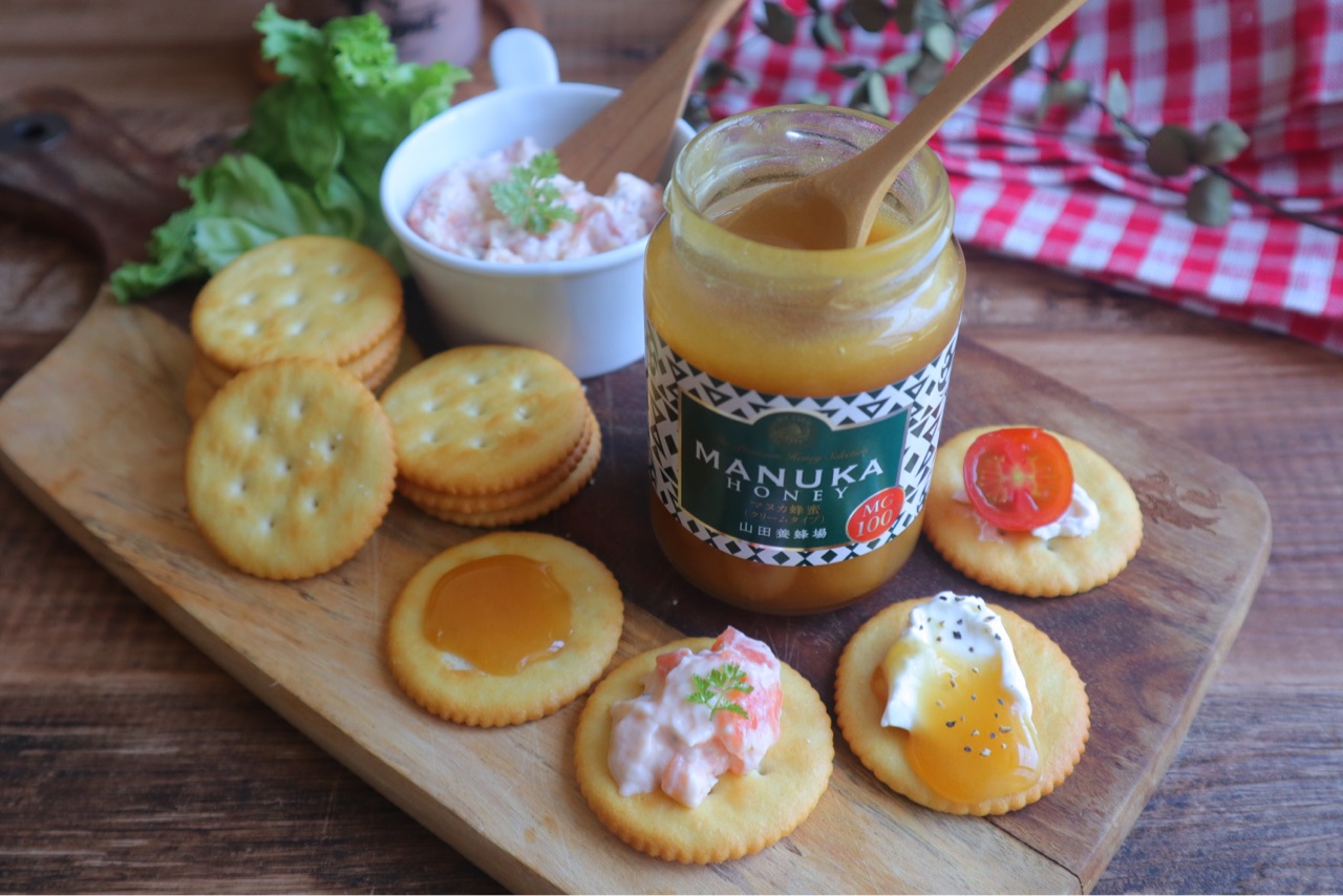 マヌカ蜂蜜はクリーム状なのでそのまま食べるにも食べやすいし、紅茶に入れたり、こうしてクラッカーやバケットにぬって食べるのもおいしい。