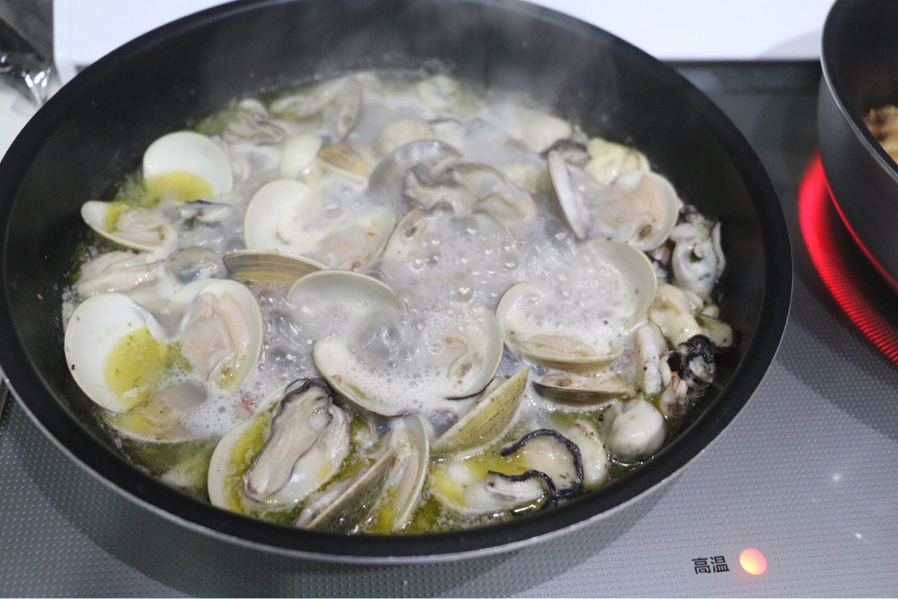 牡蠣と蛤のアヒージョ January 09, 2025 フライパンで一気にやっちゃえー!の、アヒージョ🦪白ワインとオリーブオイルは4対1くらい。白ワイン多めの方があっさり食べられるのでおすすめ!!塩、ニンニク、ブラックペッパー、鷹の爪を入れるだけでも良いんだけど、今回は塩とペッパーの代わりにガーリックソルトを入れました。↓ハウスさんの香りソルト。おいしかったよー!パンと食べたんだけど、パスタにしても良さそうだったわ!子ども達には蛤が人気