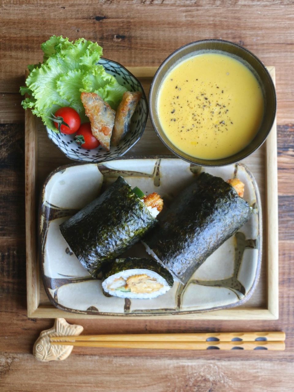 節分お昼ごはん February 03, 2026 節分なので恵方巻きでお昼ごはん。ちょっと練習がてら一本巻いて自分のお昼ごはんにしました。イワシの竜田揚げはみんなのお弁当にも入れたのよ。なので夜ごはんはイワシの登場はありません。朝ごはんの残りのにんじんポタージュも添えたんだけど。献立的には絶対味噌汁だよなーと思いながら、にんじんポタージュおいしくいただきました🙏(マルシェで買ったにんじんがめっちゃ甘かったよ🥕)𓍯𝕞𝕖𝕟𝕦 ┈┈┈┈┈┈┈┈𖠚՜ 恵方巻き𖠚՜ にんじんのポタージュスープ𖠚՜ イワシの竜田揚げ┈┈┈┈┈┈┈┈┈ ✎今年もみんな元気で過ごせますように。⭐️⭐️
