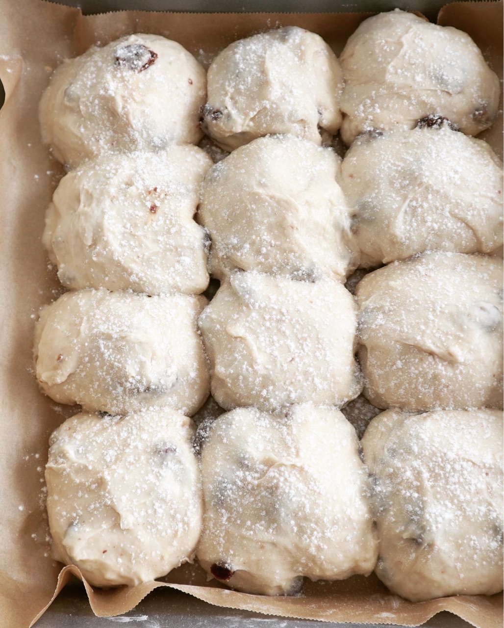 2、発酵が終わったら取り出してガスを抜き、12分割して丸め、ぬれ布巾又はぬらしたキッチンペーパーをかけて15分ベンチタイムをとる。